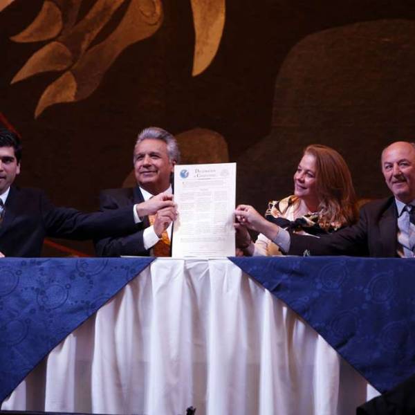 El presidente de Ecuador, Lenín Moreno, firmó la Declaración de Chapultepec con la presencia de representantes de la Sociedad Interamericana de Prensa y el Secretario General de Comunicación.