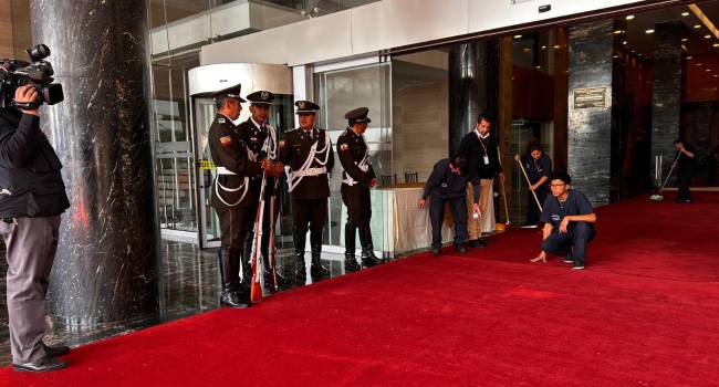 Funcionarios instalan la alfombra roja para la llegada de 151 asambleístas, quienes asumirán funciones para un periodo de cuatro años.