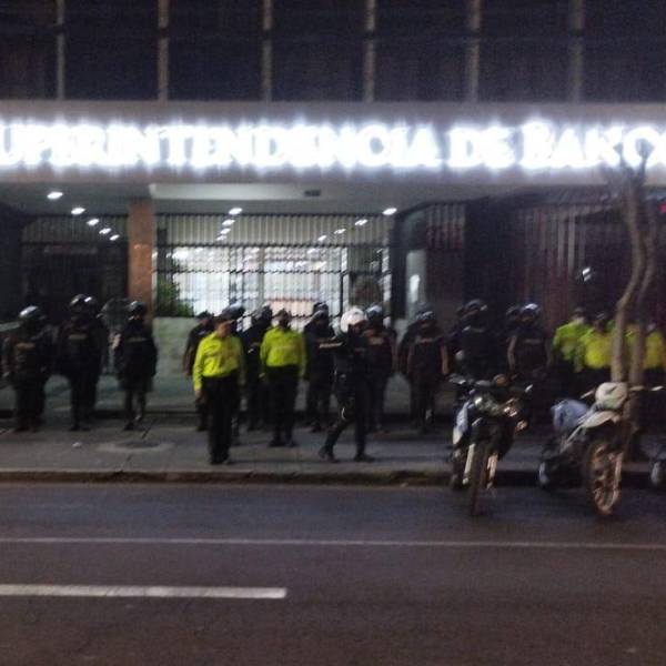 Los alrededores de la Superintendencia de Bancos permanecen rodeados por agentes de la fuerza pública.( )