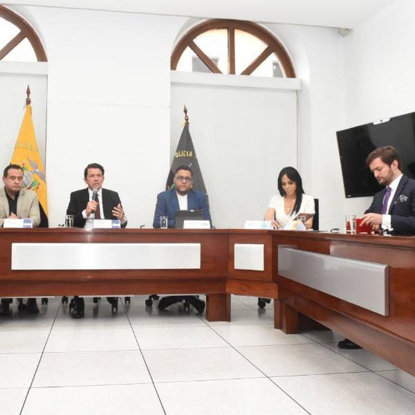 De izquierda a derecha: asambleísta de Izquierda Democrática, Marlon Cadena; viceministro de Gobernabilidad, Homero Castanier; ministro de Gobierno Francisco Jiménez; asambleísta de CREO, Juan Fernando Flores; asambleísta de UNES, Marcela Aguiñaga, y asambleísta del Partido Social Cristiano, Esteban Torres.( )
