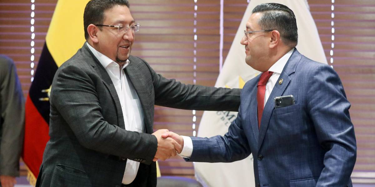 Momento en el que Iván (derecha) y Virgilio Saquicela estrechan las manos durante la entrega del proyecto.( )