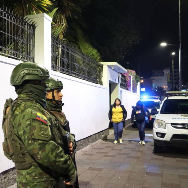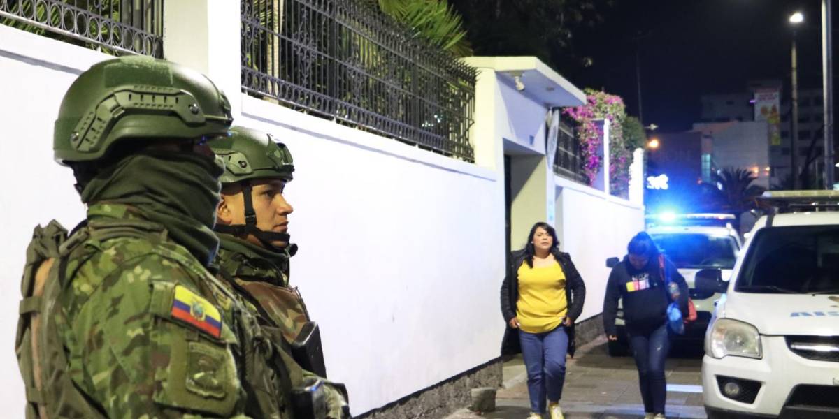 Las seguridades en los exteriores de la Embajada de México, ubicada en la intersección de las avenidas 6 de Diciembre y Naciones Unidas, en el hipercentro de Quito, se reforzaron la noche del 5 de abril de 2024. Un contingente de policías, militares y patrulleros se ubicó en las afueras de las instalaciones de esa dependencia.
