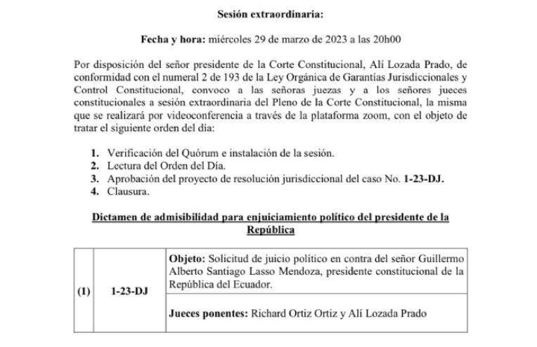 Este 29 de marzo de 2023 la Corte Constitucional decidirá si se admite o no el juicio político contra Guillermo Lasso. La sesión está programada para esta noche, a las 20:00.