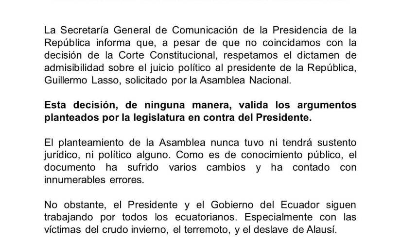 La Secretaría General de Comunicación emitió un comunicado este 29 de marzo de 2023 indicando que el Gobierno respeta la decisión de la Corte Constitucional, sobre admitir la solicitud de juicio político contra el presidente Guillermo Lasso, aunque no coincide con la decisión.