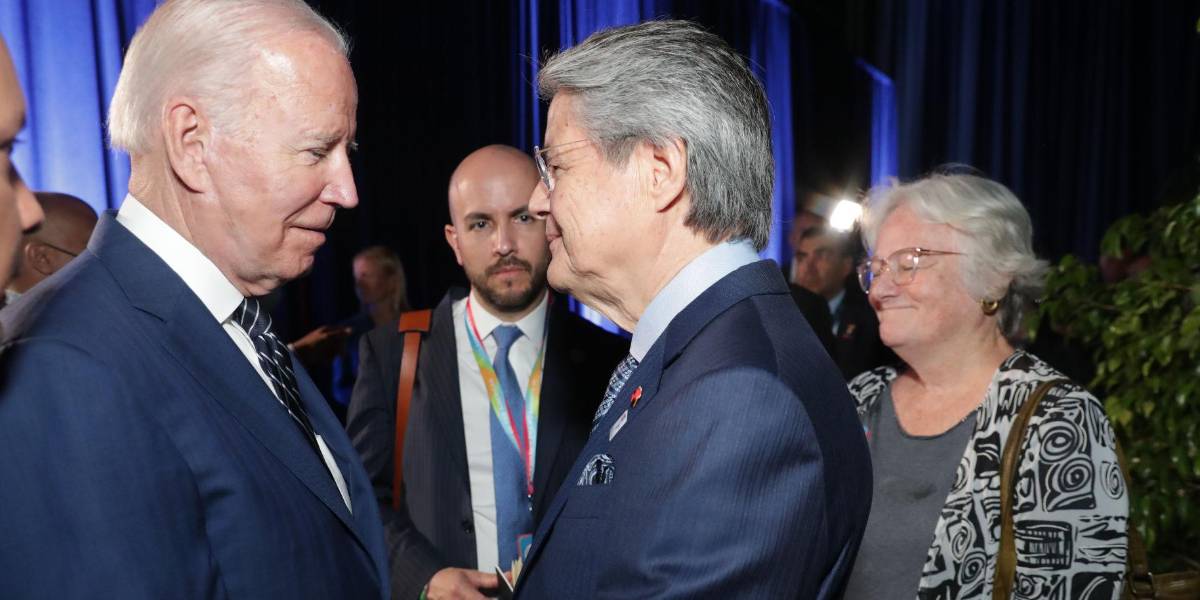 Joe Biden y Guillermo Lasso dialogan en la Cumbre de las Américas, en junio pasado. ( )
