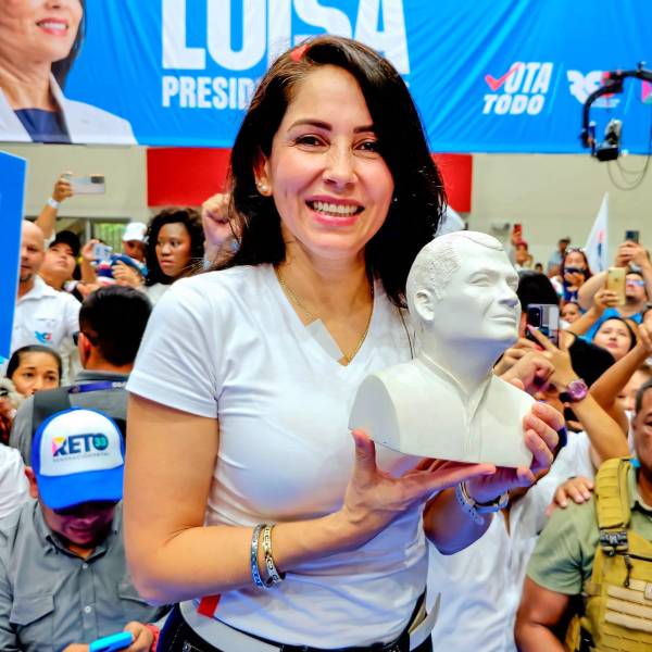 Foto de Luisa González, candidata del Movimiento Revolución Ciudadana, en un evento de campaña electoral con una estatua de Rafael Correa.( )