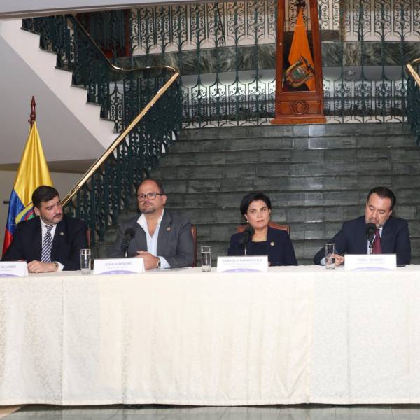 La reunión tardó cerca de dos horas y al terminar dieron declaraciones conjuntas ante la prensa. A la mesa, en el hall de ingreso de la Cancillería, se sentaron los miembros del gabinete de Daniel Noboa y dos de las autoridades más conocidas del correísmo.