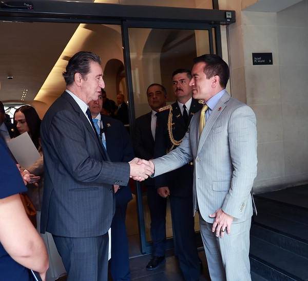 El jefe de Estado, Daniel Noboa, saluda al presidente ejecutivo del banco Rothschild & Co., Édouard de Rothschild.( )