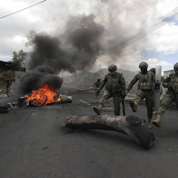 Integrantes de las Fuerzas Armadas remueven escombros después de una protesta en la avenida panamericana norte este martes, en Tabacundo (Ecuador).( )