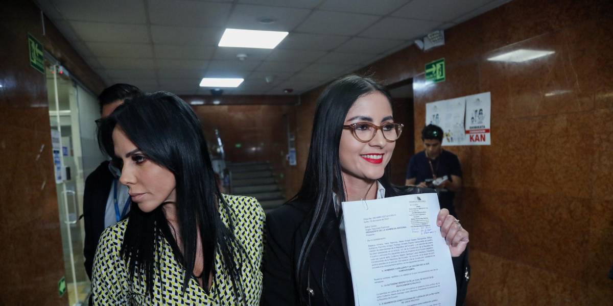 Marcela Holguín (izq.), vicepresidenta de la Asamblea; Viviana Veloz (der.) proponente del juicio político contra Lasso; en la presentación del primer documento.( )