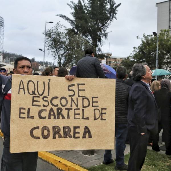 "Aquí se esconde el cartel de Correa", se leía en una pancarta de los manifestantes.