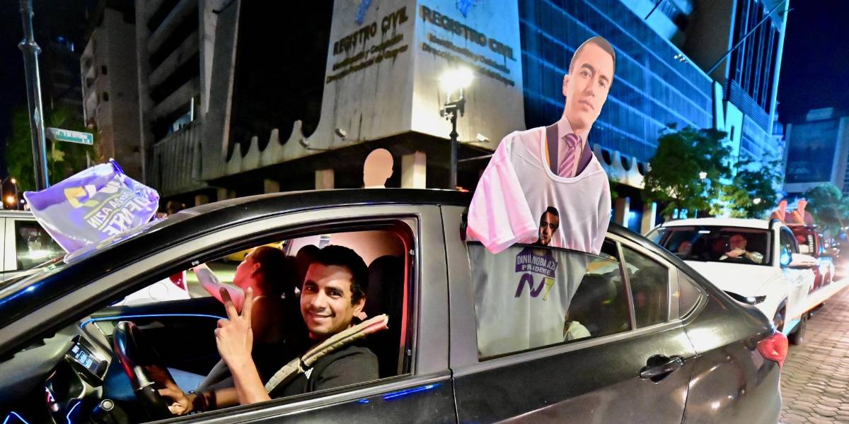 Un conductor llega una figura de cartón del presidente-candidato Daniel Noboa.( )