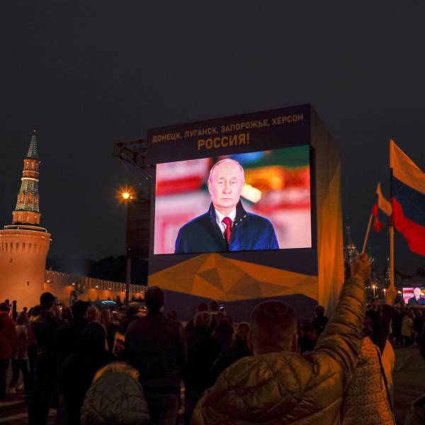 Miles de personas ven en una pantalla gigante instalada en Moscú la transmisión en vivo el discurso del presidente ruso tras firmar los tratados de adhesión de nuevos territorios a Rusia.( )