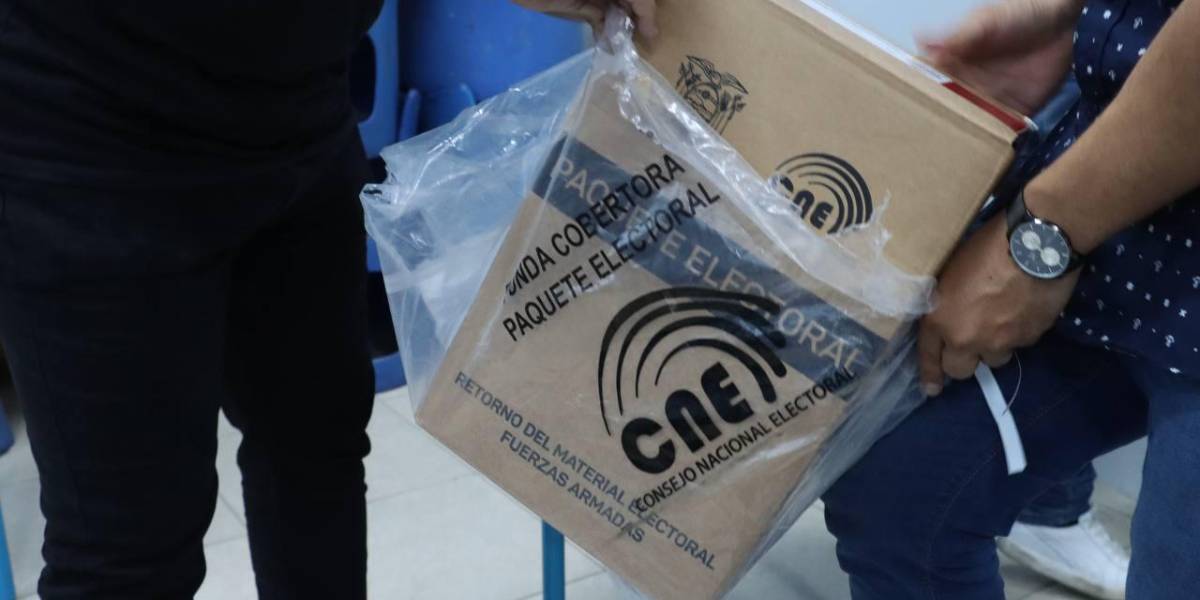 Imagen de un paquete electoral siendo embalado, después de culminar la jornada de votación en una junta receptora de votos, el domingo 13 de abril.( )
