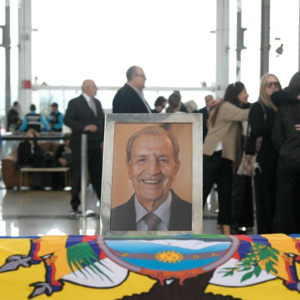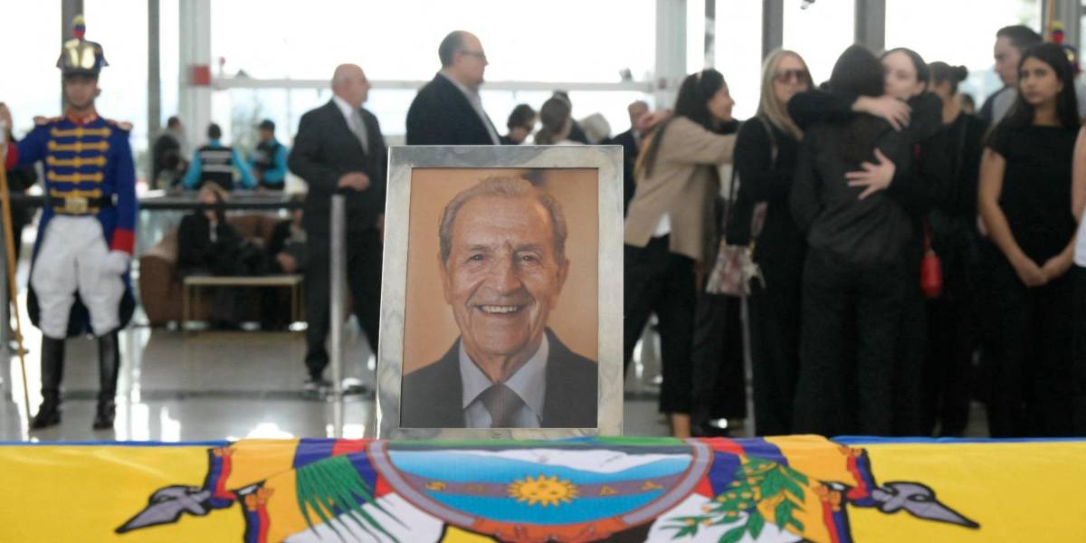 Un retrato del expresidente de Ecuador, Rodrigo Borja, junto a su ataúd durante su velorio en Quito el 19 de diciembre de 2025.( )