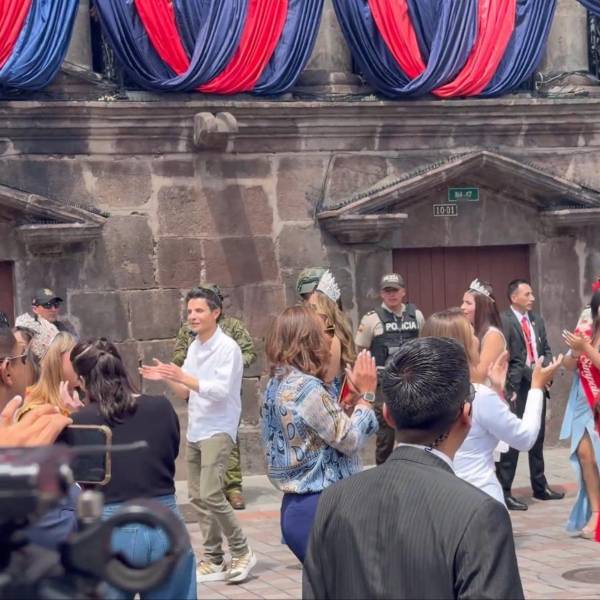 Merino saludó desde el balcón del Palacio de Carondelet. También bajó a la calle para bailar el Chullita Quiteño junto a ministras como Zaida Rovira, Nataly Morillo, la Reina de Quito y su corte de honor.