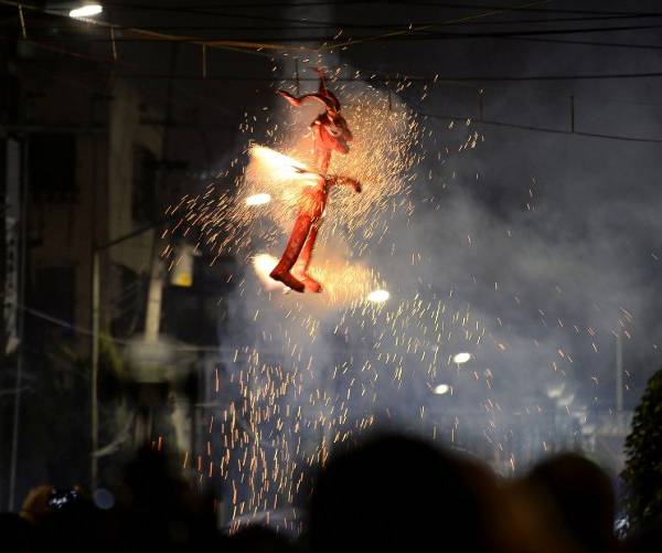 Colgadas con cuerdas a techos de casas de la calle de la familia Linares, figuras coloridas de papel maché (hecho con periódico, harina y agua), como una del presidente Enrique Peña Nieto con el logo de Televisa en el pecho, se incendian y explotan ante el jolgorio de los asistentes.