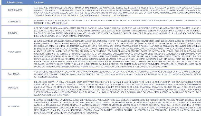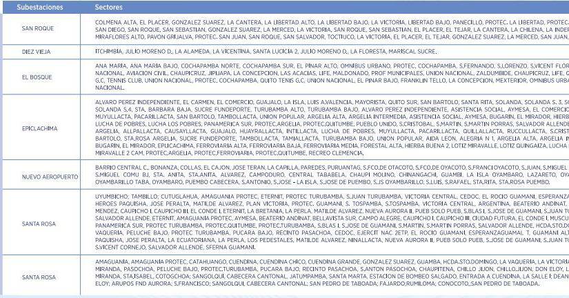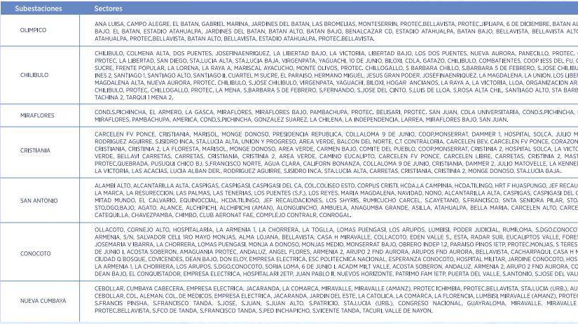 En la segunda, no habrá electricidad en Barrionuevo, La Floresta, Río Coca, Cotocollao, San Rafael, Pomasqui y El Quinche. Y la tercera: San Roque, Diez Vieja, El Bosque Epiclachima, Nuevo Aeropuerto y Santa Rosa.