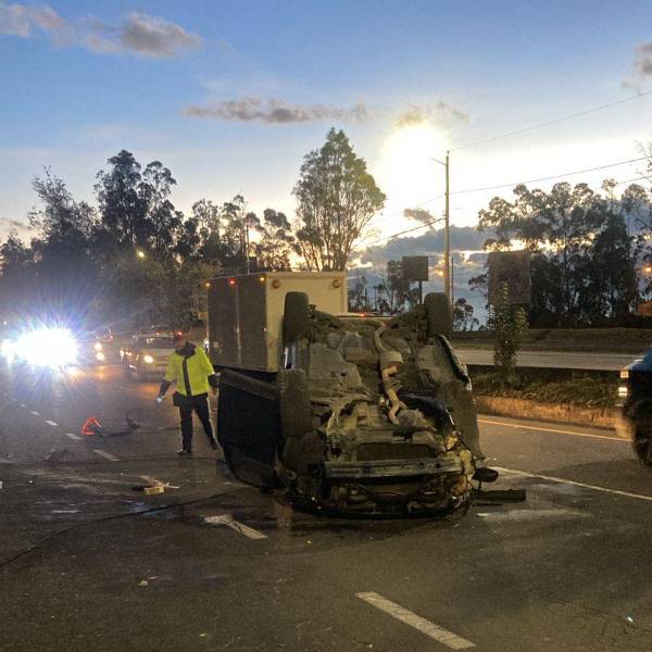 Un siniestro de tránsito se dio, al amanecer de este viernes 5 de septiembre de 2025, en la avenida Simón Bolívar, a 500 metros de la conexión con la Autopista General Rumiñahui, oriente de Quito. Un automóvil se volcó en el carril de sentido norte-sur y en la zona se produjo una fuerte congestión vehicular.