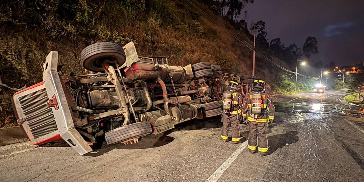 Quito | Un camión se volcó en la av. Simón Bolívar y derramó brea en la calzada