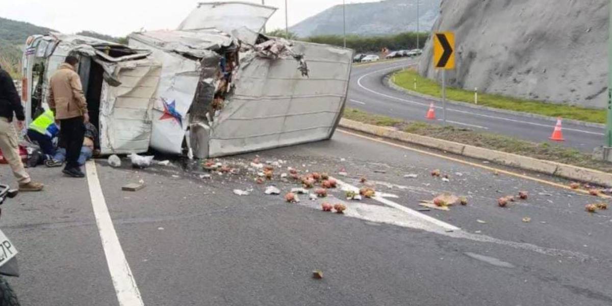 Las imágenes muestran que el camión se volcó en la curva de la vía. Su carrocería quedó destruida y la fruta que transportaba quedó esparcida en la vía.