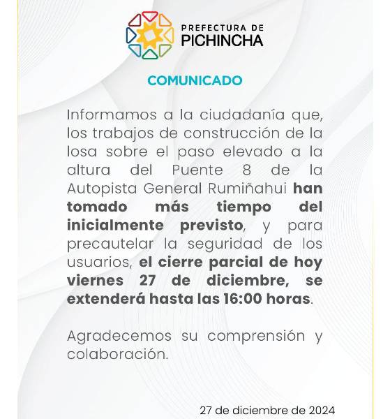 Cierres de tres horas se realizarán a la altura del Puente 8, en la Autopista General Rumiñahui, entre el viernes 27 y el domingo 29 de diciembre. En la zona se efectuarán trabajos para colocar la losa del paso elevado, informó la Prefectura de Pichincha.