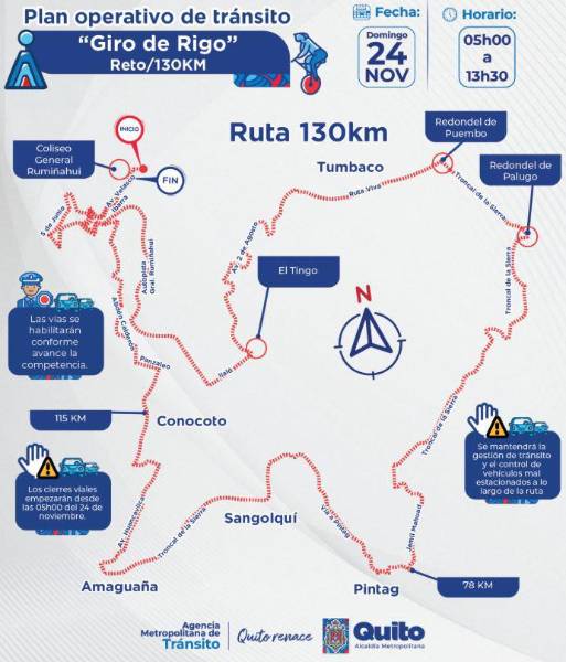 La AMT prevé 46 cierres viales principales y 201 secundarios en Quito y los Valles por la competencia ciclística Giro de Rigo que se desarrollará este domingo 24 de noviembre.