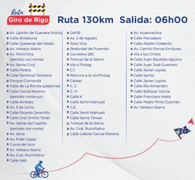 Al menos 2 000 ciclistas ecuatorianos y extranjeros recorrerán Quito, el cantón Rumiñahui, y las parroquias de Conocoto, Amaguaña y Píntag en el recorrido que consta de categorías por género y edad, y en tres rutas: Basílica (corta), 50 kilómetros; Panecillo (intermedia), 90 kilómetros; y Mitad del Mundo (larga), 130 kilómetros.