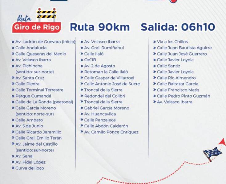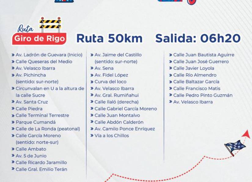 La ruta más larga, de 130 kilómetros, es la que más cierres viales tiene. Empieza en la av. Ladrón de Guevara y termina cerca de ese mismo punto, en la av. Velasco Ibarra.