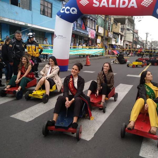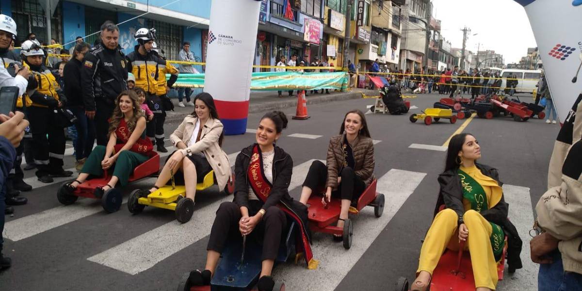Reina de Quito y su corte de honor en una competencia de coches de madera en el 2019. ( )