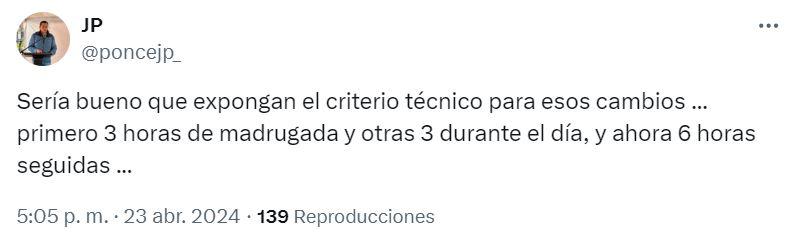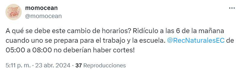 "¿No podrán hacer el favorcito de dejar un horario fijo de cortes de luz? Es imposible planificar si te avisan de los horarios 24 horas antes, en el mejor de los casos", comentó en la red social X el abogado Gustavo Chiriboga.