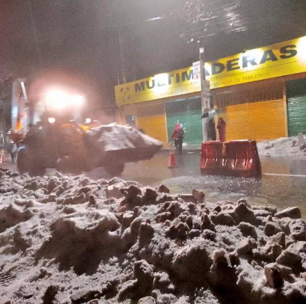 “Se cayó el galpón de mi esposo. Toda la terraza se llenó de hielo”, expresó la mujer. El granizo colapsó techos, calles y locales comerciales en el valle de Los Chillos, en donde se atendieron más de 12 emergencias entre leves y graves.