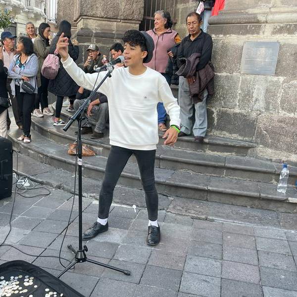 En la esquina de las calles García Moreno y Sucre del Centro Histórico de Quito, todos los domingos se escucha las melodías de música salsa acompañada de una fresca voz juvenil que cautiva a los turistas, peatones y comerciantes del sector.