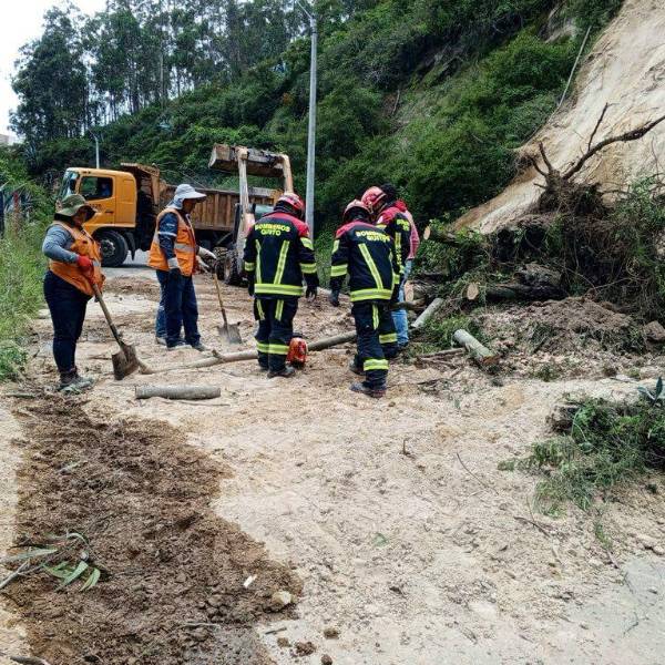 Obreros del Municipio de Quito limpian un deslizamiento de tierra. ( )