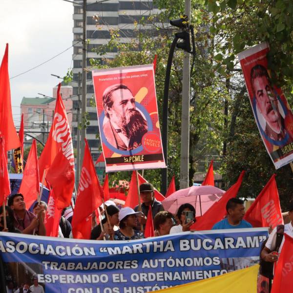 Diferentes movimientos sindicales y sociales se congregaron desde la mañana de este jueves 1 de mayo de 2025 en la Caja del Seguro del IESS, centro norte de Quito, para marchar por el Día del Trabajador.