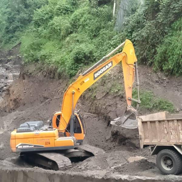 La Empresa Pública Metropolitana de Agua Potable (Epmaps) efectúa la remoción de escombros y sedimentos con una volqueta y retroexcavadora.