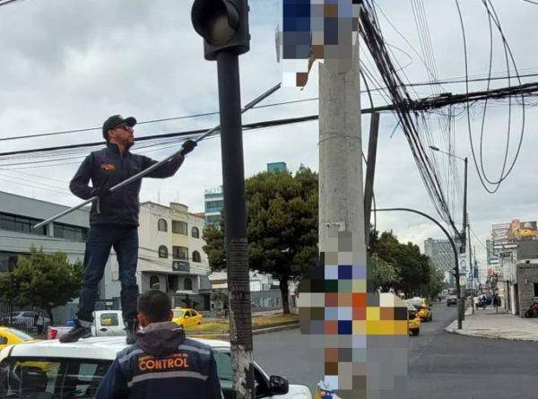 El personal de la AMC retira pancartas electorales en una vía de Quito. ( )