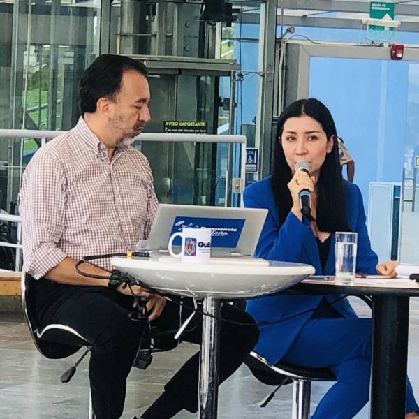El alcalde Pabel Muñoz y la secretaria de Seguridad, Carolina Andrade, durante el enlace Frecuencia Quiteña.( )