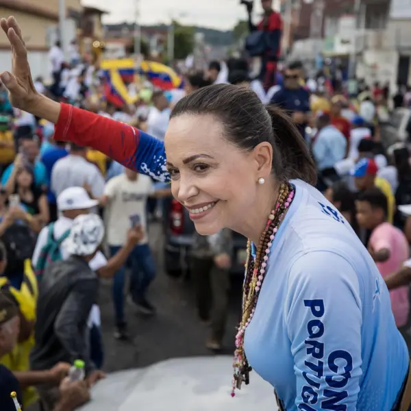 Fotografía de archivo del 17 de julio de 2024 que muestra a la líder opositora, María Corina Machado, en un acto de campaña el 17 de julio del 2024 en Guanare (Venezuela). ( )