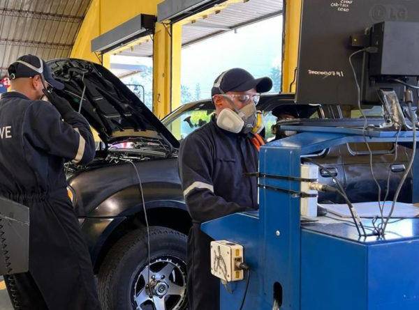 Dos técnicos en uno de los centros de revisión técnica vehicular en Quito. ( )