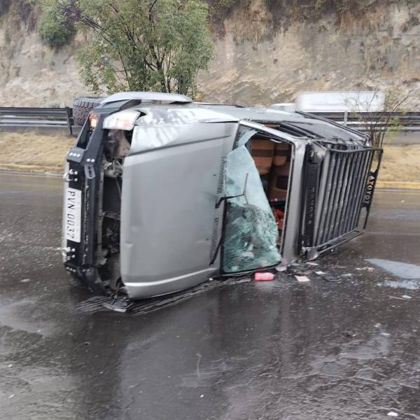 En la avenida Simón Bolívar a la altura de San Juan de Cumbayá una camioneta quedó volcada y con su parabrisas destruido.