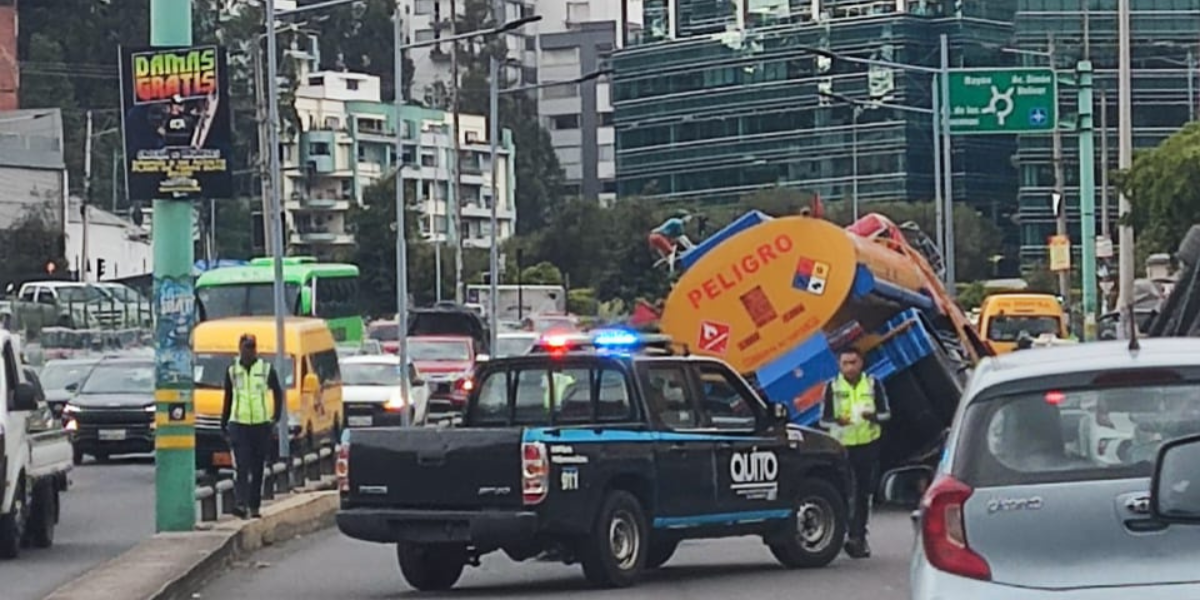 Un tanquero de combustible se accidentó en la avenida De Los Granados, antes de llegar al Redondel del Ciclista, norte de Quito, la tarde de este miércoles 12 de marzo.