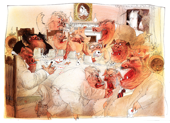 Quienes moran la Granja Animal siguen creyendo hasta el final en los discursos falaces (excepto el burro, ¡qué inteligente es! Y aplausos para el gato ocioso, que se escabulle y le da lo mismo la esclavitud disfrazada de libertad a la que están sometidos sus compañeros).