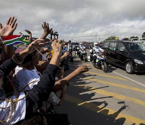 El baile y los cánticos de agradecimiento a Mandela cesaron de golpe para transformarse en vítores cuando el féretro, escoltado por efectivos motorizados de la Policía Militar, tanquetas del Ejército y dos helicópteros, pasó por delante de quienes esperaban a su héroe a la entrada de Qunu.