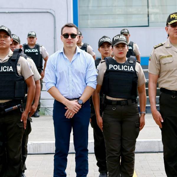 Imagen de Daniel Noboa, presidente de Ecuador, junto a policías el 11 de julio del 2024, cuando entregó más de 11 000 chalecos antibalas.( )