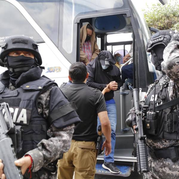 Imagen de detenidos por el caso Metástasis siendo trasladados a Quito, el pasado 14 de diciembre de 2023.( )