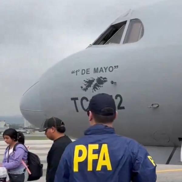 Imagen de Michelle Macías e Inda Peñarrieta bajando del avión militar argentino en Guayaquil, Ecuador.( )