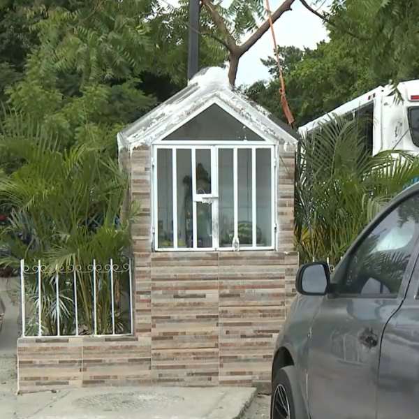 La imagen fue colocada hace varios días en medio de un parterre. La escultura miniatura de un esqueleto cubierto con un manto está dentro de un altar en una estructura de cemento, cerámica y vidrio. Fue construido a pocos metros de una estación de buses. Alrededor del altar han dejado frutas, botellas y copas con licor.