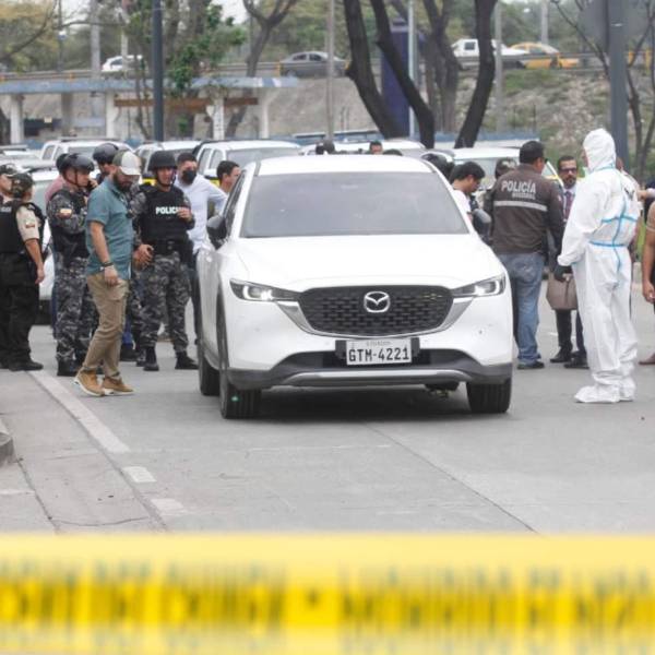 Imagen del 17 de enero de 2024. Policías y personal de Criminalística inspeccionan el vehículo en el que se movilizaba el fiscal César Suárez, quien fue acribillado en Los Ceibos, en el norte de Guayaquil.( )