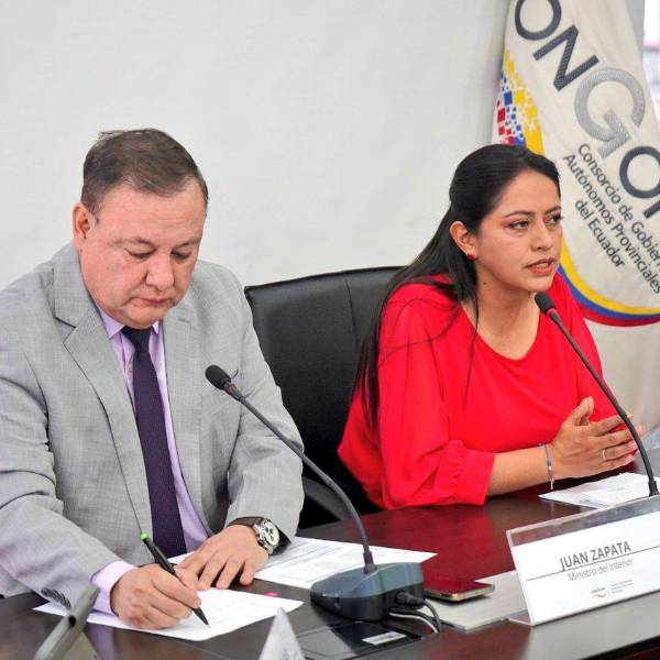 El ministro del Interior, Juan Zapata, y la prefecta de Pichincha, Paola Pabón, durante una rueda de prensa este 7 de agosto del 2023. ( )